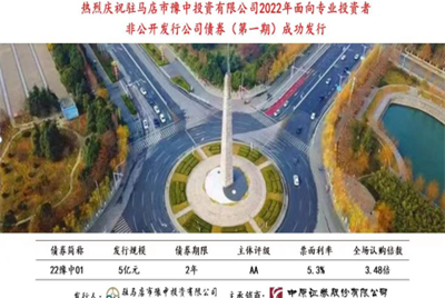 (第一期)成功發(fā)行8月30日,駐馬店市豫中投資有限公司(以下簡稱“豫中公司”)2022年第一期非公開公司債券在上海證券交易所發(fā)行成功,本次債券獲批總規(guī)模10億元,首期發(fā)行規(guī)模5億元,發(fā)行期限2年期,票面利率5.3%,認購倍數3.48倍,達17.4億元,與周邊市場相比,創(chuàng)造了發(fā)債效率高、時間短…