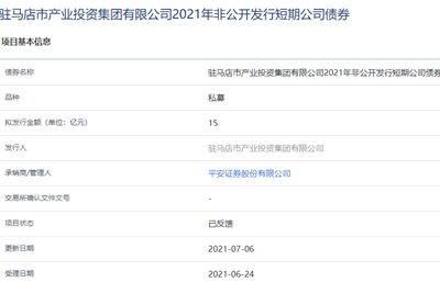 7月6日,據(jù)上交所公司債券項目信息平臺顯示,駐馬店市產(chǎn)業(yè)投資集團有限公司2021年非公開發(fā)行短期公司債券獲上交所反饋。該債券擬發(fā)行金額為15億元,品種為私募債,承銷商及管理人為平安證券。